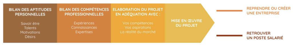 Objectif : hiérarchiser et structurer les projets de manière pragmatique jusqu’à bâtir un projet professionnel réaliste puis établir le « cahier des charges » de ce projet en fonction de sa nature : poste salarié, entreprise à reprendre, activité à créer…